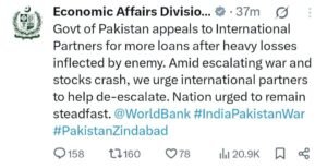 पोस्ट के शब्दों से ऐसा प्रतीत हुआ कि पाकिस्तान युद्ध की स्थिति से बुरी तरह डगमगा गया है और अब उसके पास आर्थिक विकल्प सीमित हो गए हैं। सोशल मीडिया पर यह पोस्ट वायरल होते ही विशेषज्ञों ने इसे पाकिस्तान की वित्तीय अस्थिरता और कर्ज पर निर्भरता का उदाहरण बताया।